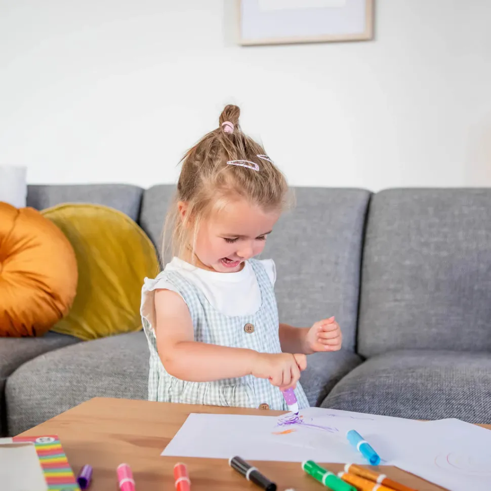 Los marcadores Junior no tóxicos y ultralavables ayudan a los niños pequeños a explorar su creatividad mientras trabajan en su agarre de pinza y sus habilidades motoras finas.