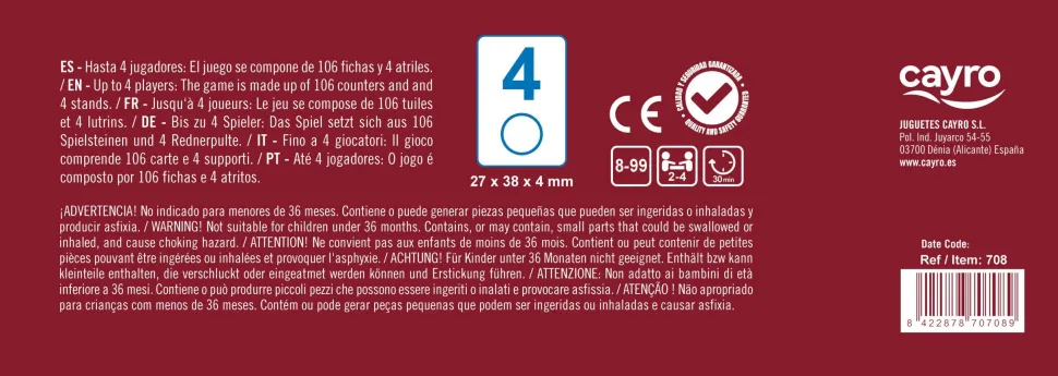 Simple y apasionante juego en el que cada jugador deberá combinar sus fichas, haciendo grupos de un mismo número en diferentes colores o escaleras de un mismo color para conseguir quedarse sin fichas. Versión hasta 4 jugadores.