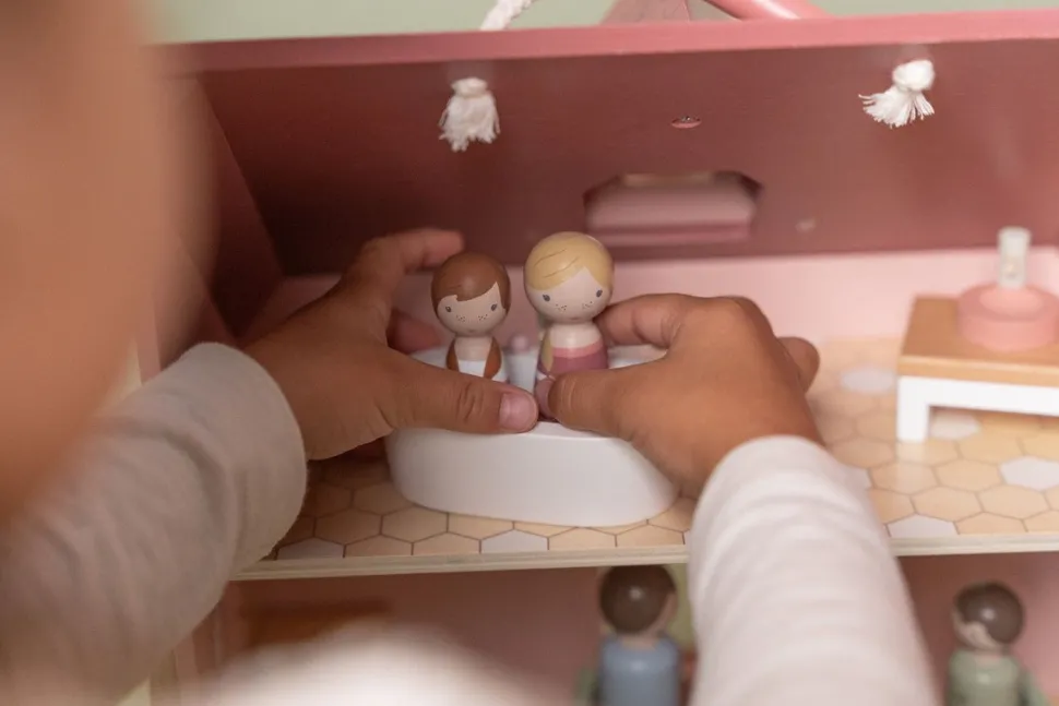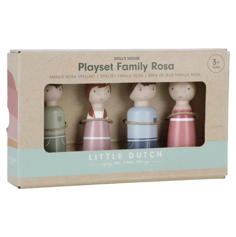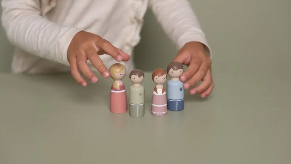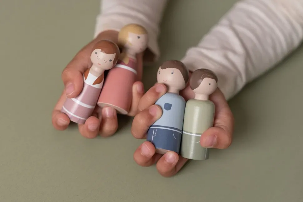 Esta familia es un conjunto de muñecos con clavijas de madera, formado por un padre, una madre, un hijo y una hija. Este conjunto de expansión es una gran set extra para la casa de muñecas de Little Dutch. Garantiza horas de diversión.