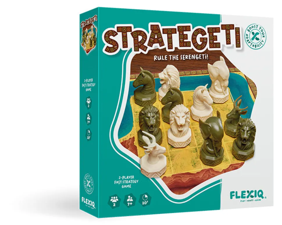 ¡Gobierna el Serengueti! Strategeti es un juego de estrategia divertido, rápido y alocado para 2 jugadores con reglas sencillas. ¡Fácil de aprender, pero difícil de dominar! ¡Intenta dominar el Serengeti colocando y moviendo ingeniosamente a tus animales en el tablero de 4×4! Los elefantes repelen a otros animales, incluso llevándolos al río infestado de cocodrilos o al barranco. Los leones se comen a las gacelas y a las cebras. Las gacelas pueden saltar sobre otros animales, ¡incluso varias veces en un turno! Las cebras, por fin, pueden correr libremente en cualquier dirección. ¡Haz que colaboren y maximizarás tus posibilidades de ganar!