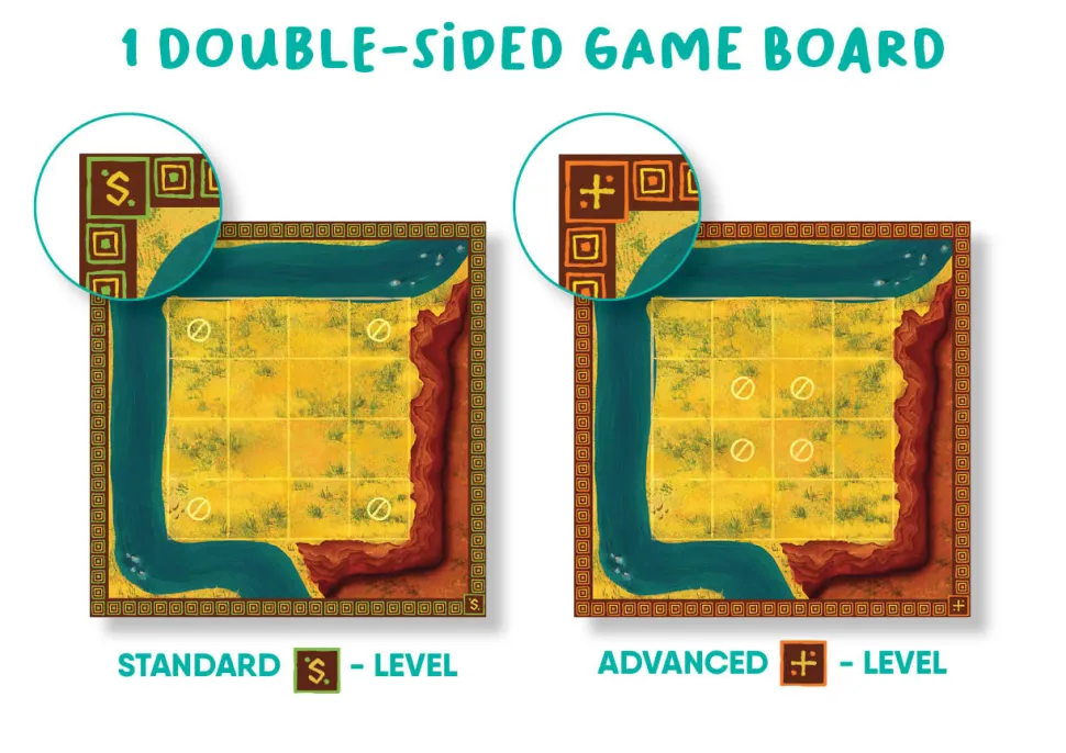 Para dominar el Serengeti y ganar el juego, coloca 4 de tus animales en una línea horizontal, vertical o diagonal, elimina 5 de los animales de tu oponente o bloquéalos para que no se muevan. El tablero de juego a doble cara tiene diferentes puntos de entrada y lo que te desafiará a cambiar completamente tu estrategia entre los dos niveles de juego.