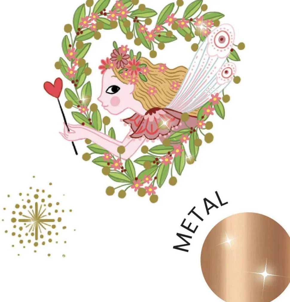 Dos planchas de tatuajes temporales sobre el tema de las hadas. ¡Para deleitar a los niños, están llenos de pequeños detalles dorados! Son fáciles de usar, están precortados y se aplican con un poco de agua