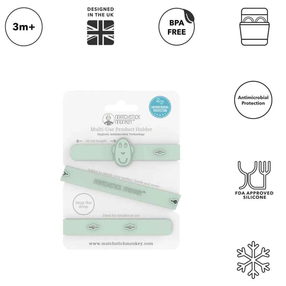 El diseño universal funciona con el chupete favorito de tu bebé, cualquiera de tus mordedores Matchstick Monkey e incluso juguetes pequeños.