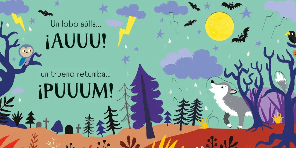 Fantasmas que gimen, brujas a carcajadas, truenos que retumban y lobos que aúllan en este irresistible libro lleno de sorpresas escalofriantes. Los niños podrán mover los paneles deslizantes para escuchar los sonidos de los terroríficos personajes. Los paneles emiten un sonido al deslizarlos en una dirección y otro distinto al volver atrás, lo cual genera un efecto inesperado que encantará a los más pequeñines.