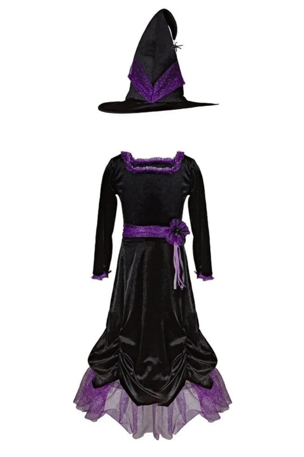 ¡Vera, un vestido y sombrero de brujita de terciopelo! Este vestido está confeccionado con un precioso terciopelo negro suave y adornado con detalles en morado. Precioso tul con purpurina violeta embellece la cintura, el escote, las mangas y el volante del bajo. Este vestido incluye un aro para darle volumen y la falda de terciopelo negro cubre el aro. ¡Hay una araña negra con brillo en la cintura a la altura de la cadera, y también una araña negra con brillo cuelga del fantástico sombrero! ¡Elegante, con estilo y absolutamente adorable!