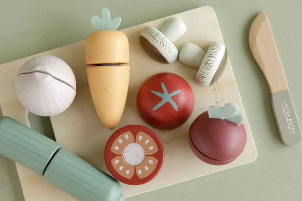 ¡Come tus vegetales! Este conjunto de vegetales de madera es una forma lúdica de estimular el juego de rol de su hijo. ¡Corta las verduras con el cuchillo de madera y la tabla de cortar incluida y conviértete en el mejor chef! Las verduras incluidas son: zanahoria, champiñones, pepino, tomate, cebolla y remolacha. Todo se puede dividir en dos piezas y volver a unir con velcro.