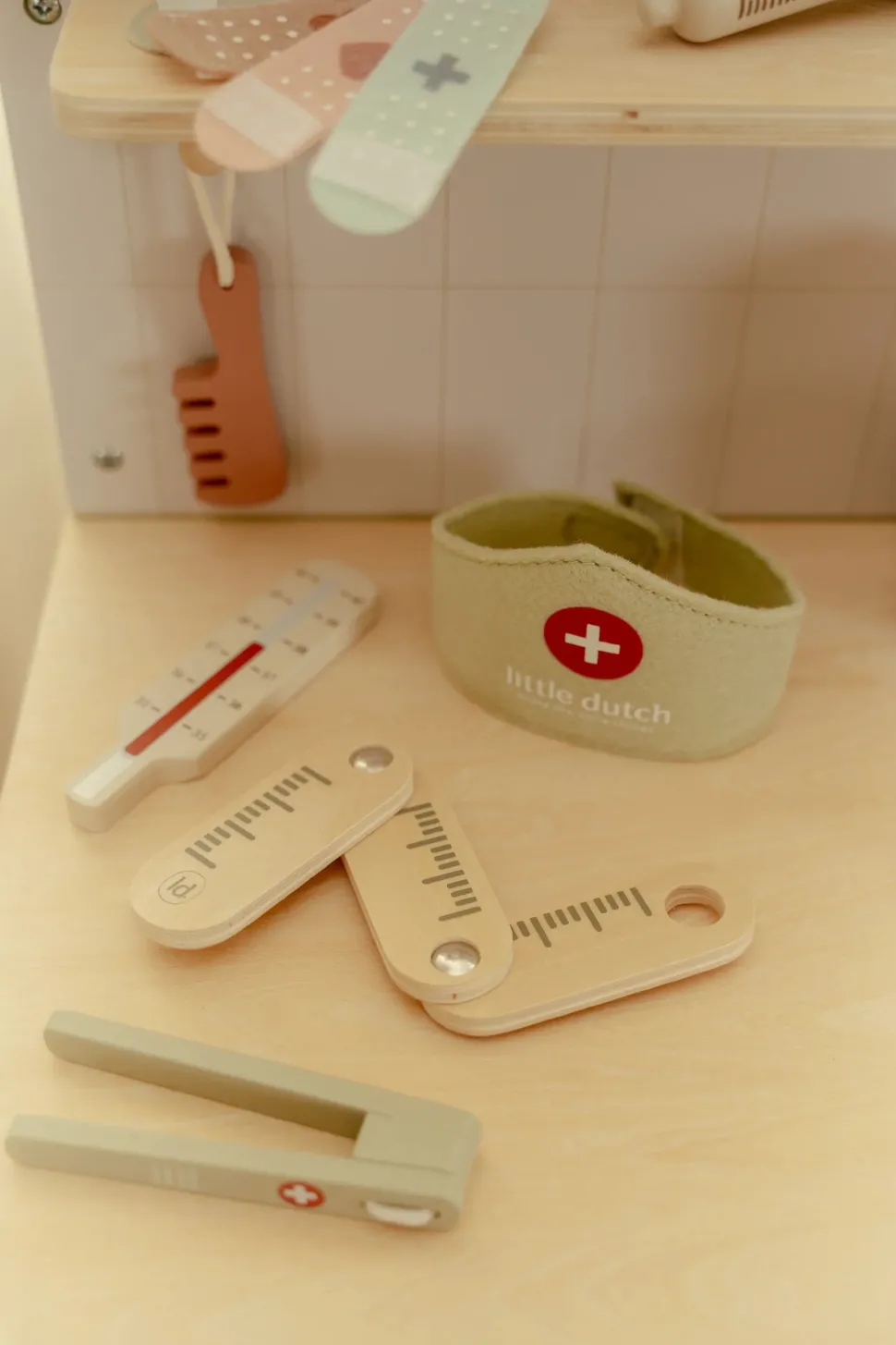 ¿Cuidas bien de peluches y mascotas de juguete enfermas? Con esta amplia clínica veterinaria de madera, tu pequeño podrá sumergirse por completo en el rol de un veterinario de verdad. El set contiene todo lo necesario para cuidar mascotas, como una ducha retráctil con lavabo, un peine, un termómetro, una jeringa y vendas. También incluye una diadema de tela y un clip especial para mostrar ilustraciones médicas y radiografías. ¡Hora del siguiente paciente!